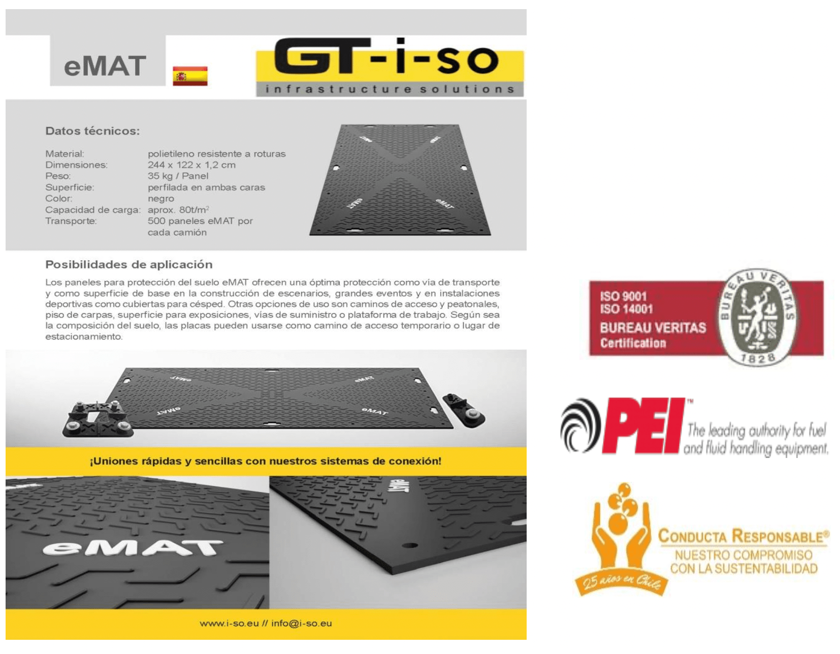 Los paneles para protección del suelo eMAT ofrecen una óptima protección como vía de transporte y como superficie de base en la construcción de escenarios, grandes eventos y en instalaciones deportivas como cubiertas para césped. Otras opciones de uso son caminos de acceso y peatonales, piso de carpas, superficie para exposiciones, vías de suministro o plataforma de trabajo. Según sea la composición del suelo, las placas pueden usarse como camino de acceso temporario o lugar de estacionamiento.
